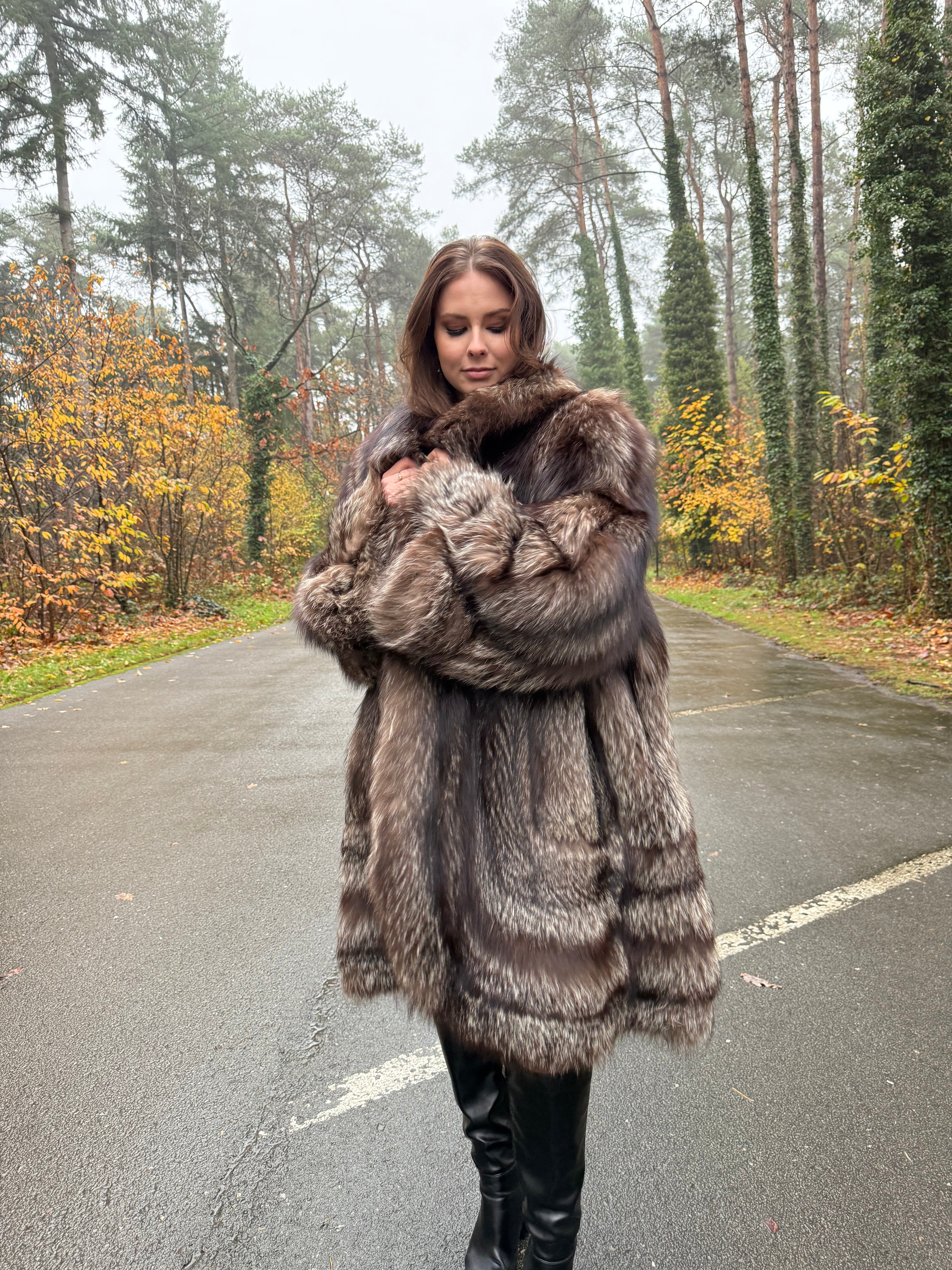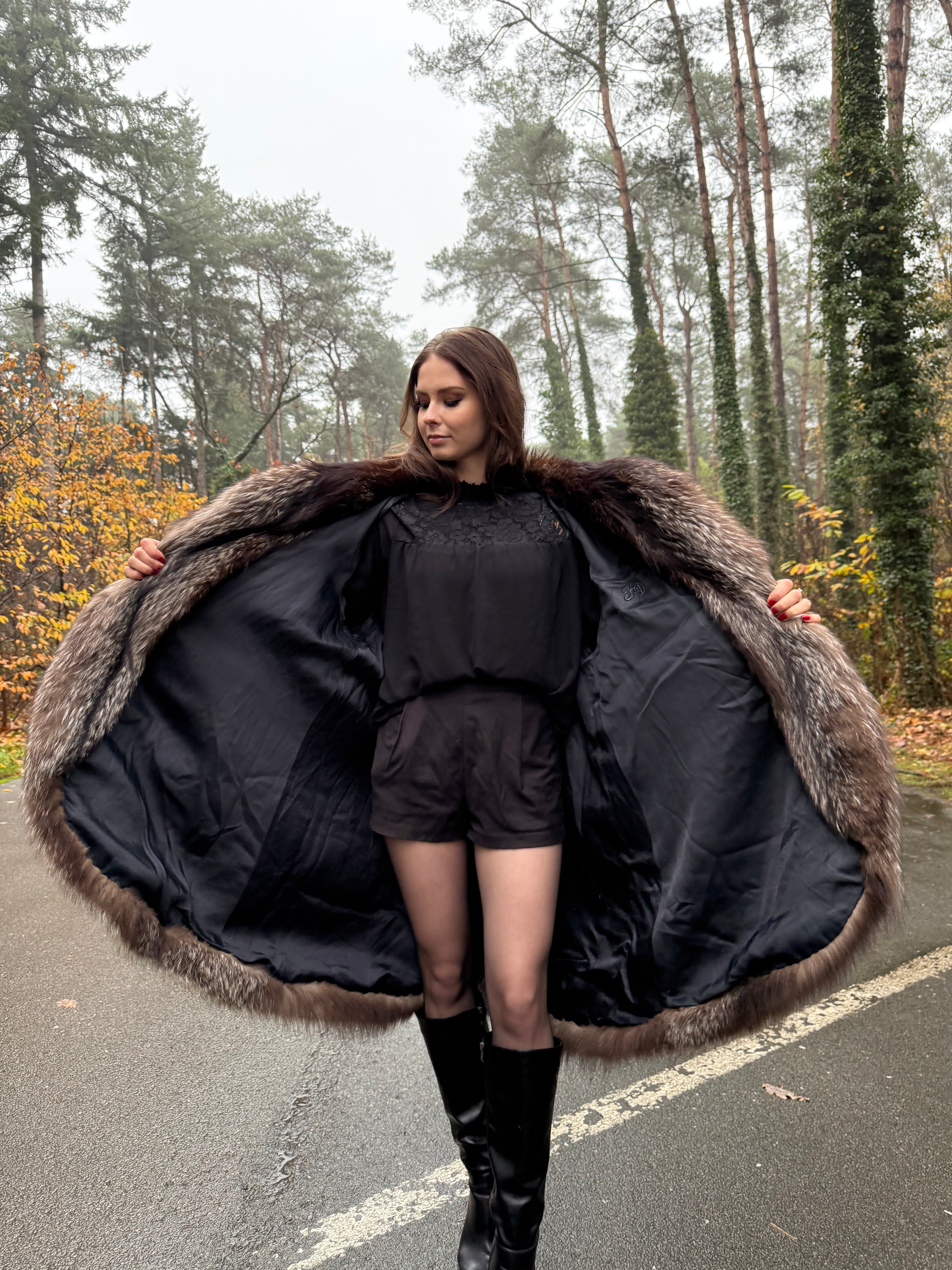 Silver fox fur coat with black leather, XL real fur coat, vintage fur coat, leather fox coat, fox coat, fur coat, pelzmantel, fox fur coat