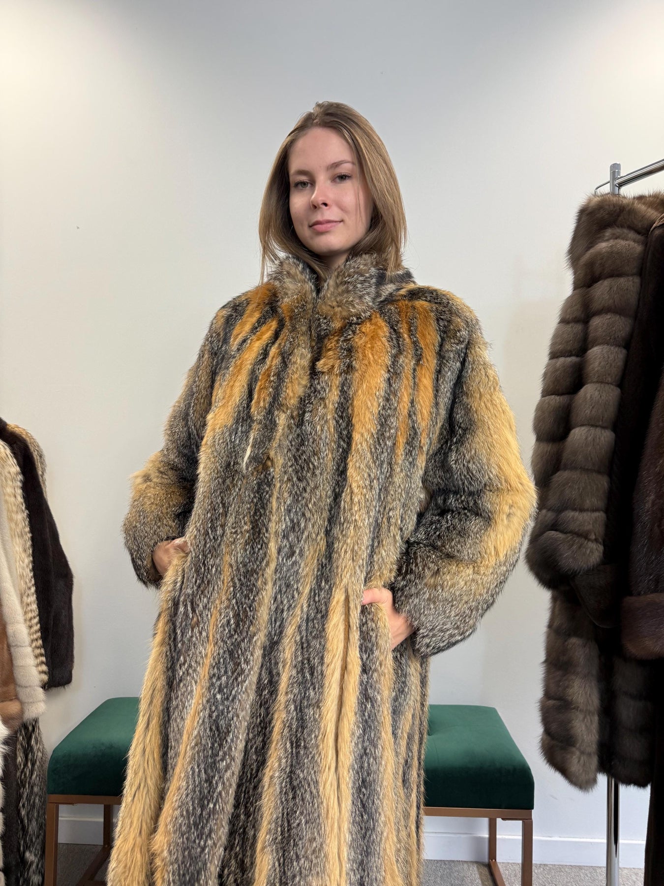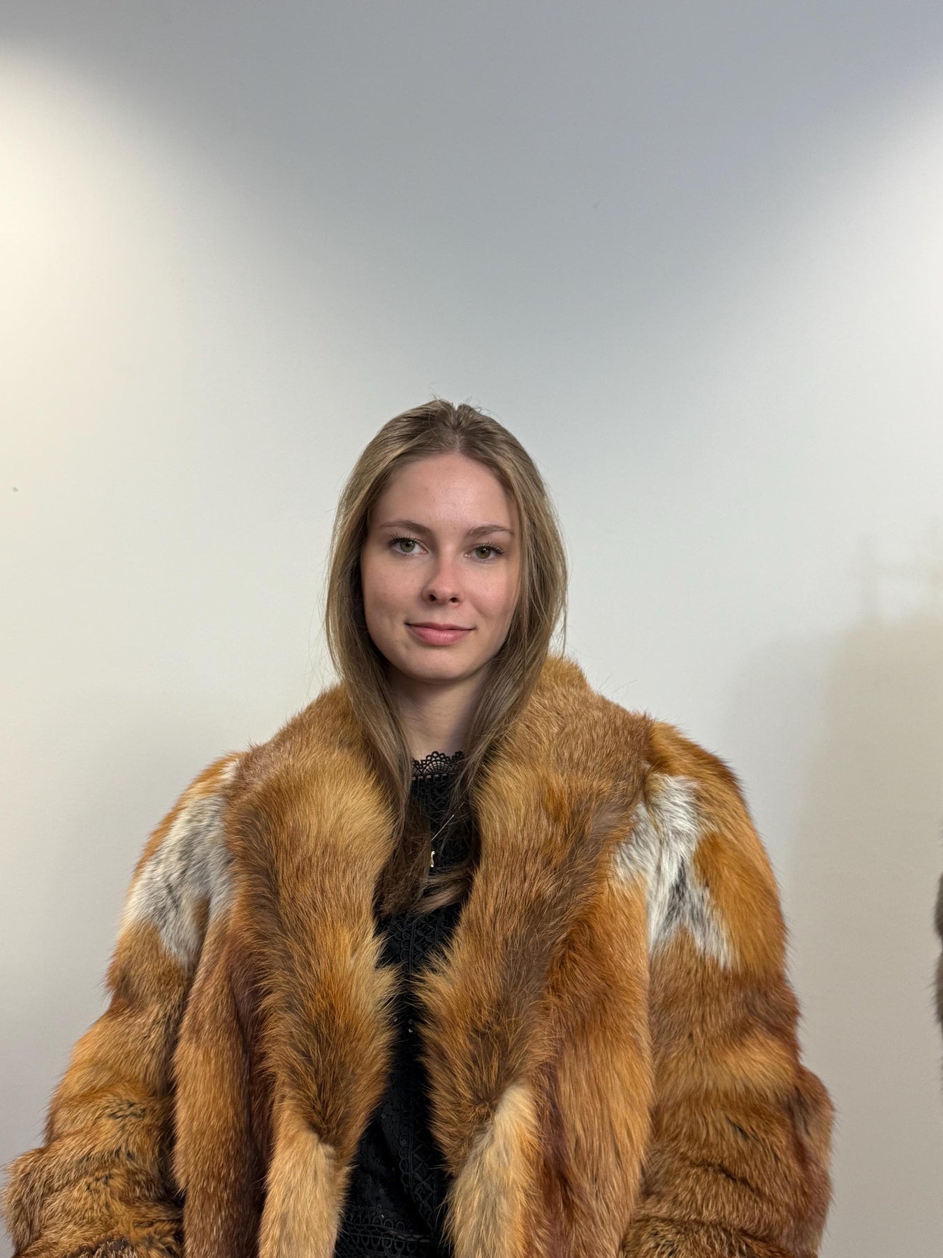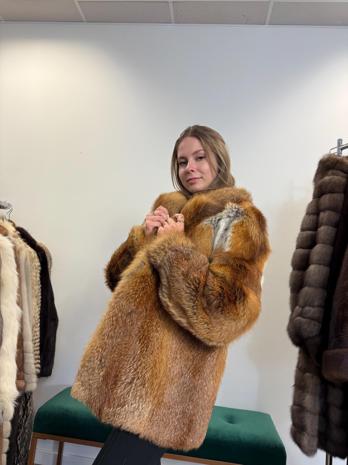 Full body view of red fox fur jacket worn by model, women’s soft real vintage fur.