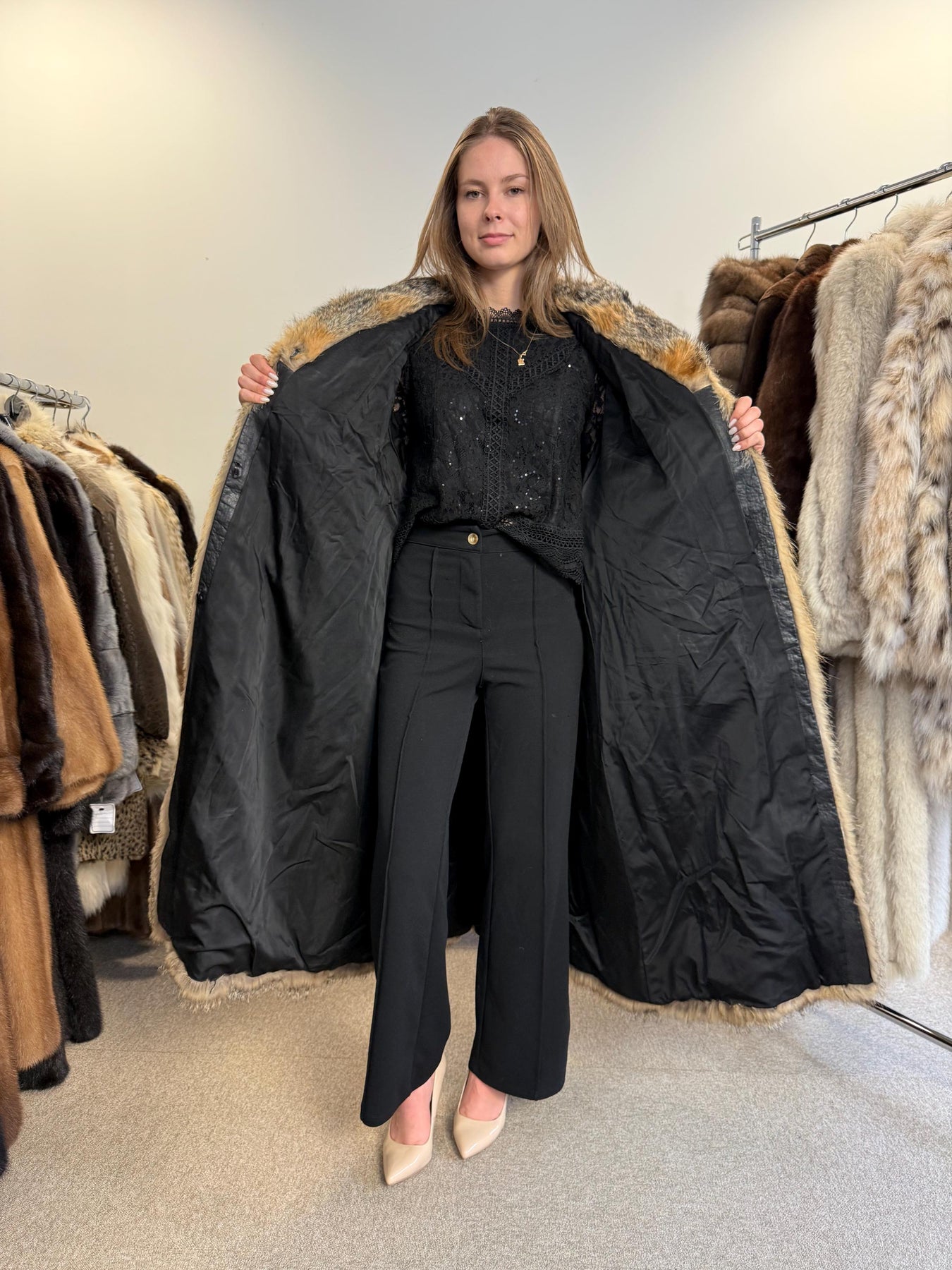 Back view of real grey fox fur coat, women’s L/XL, vintage elegant long fur design.