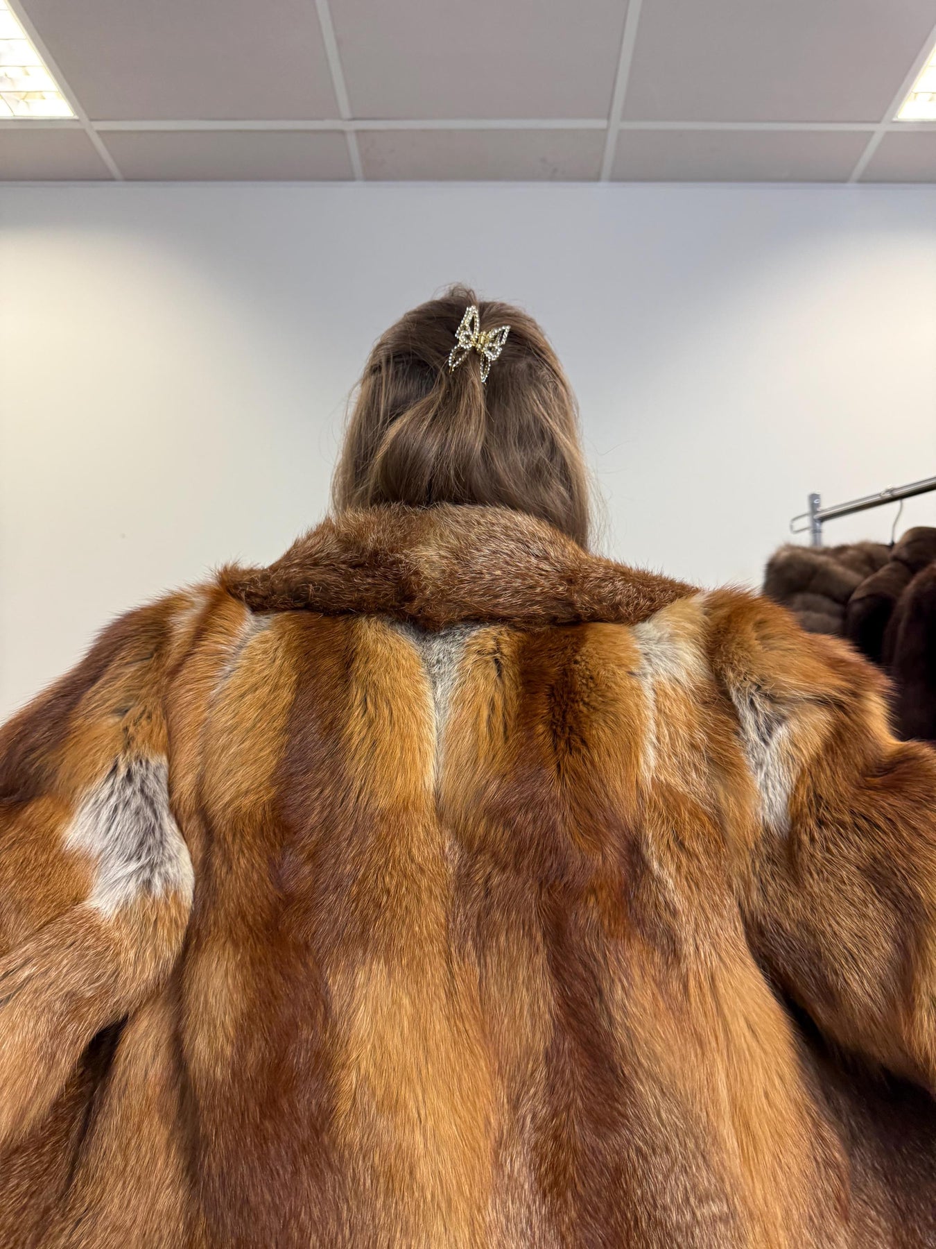 Open front view of red fox fur jacket, women’s vintage soft real fur.