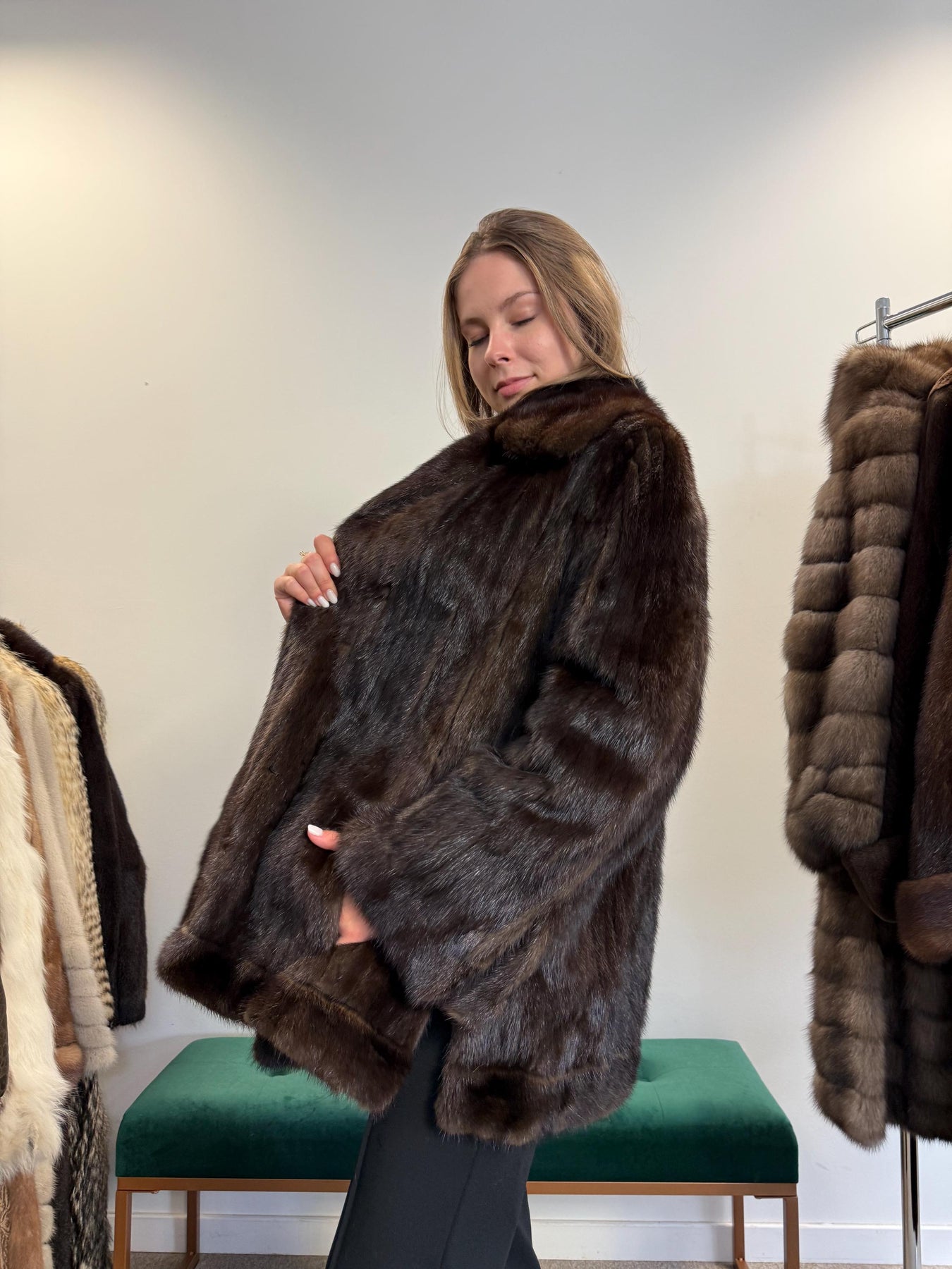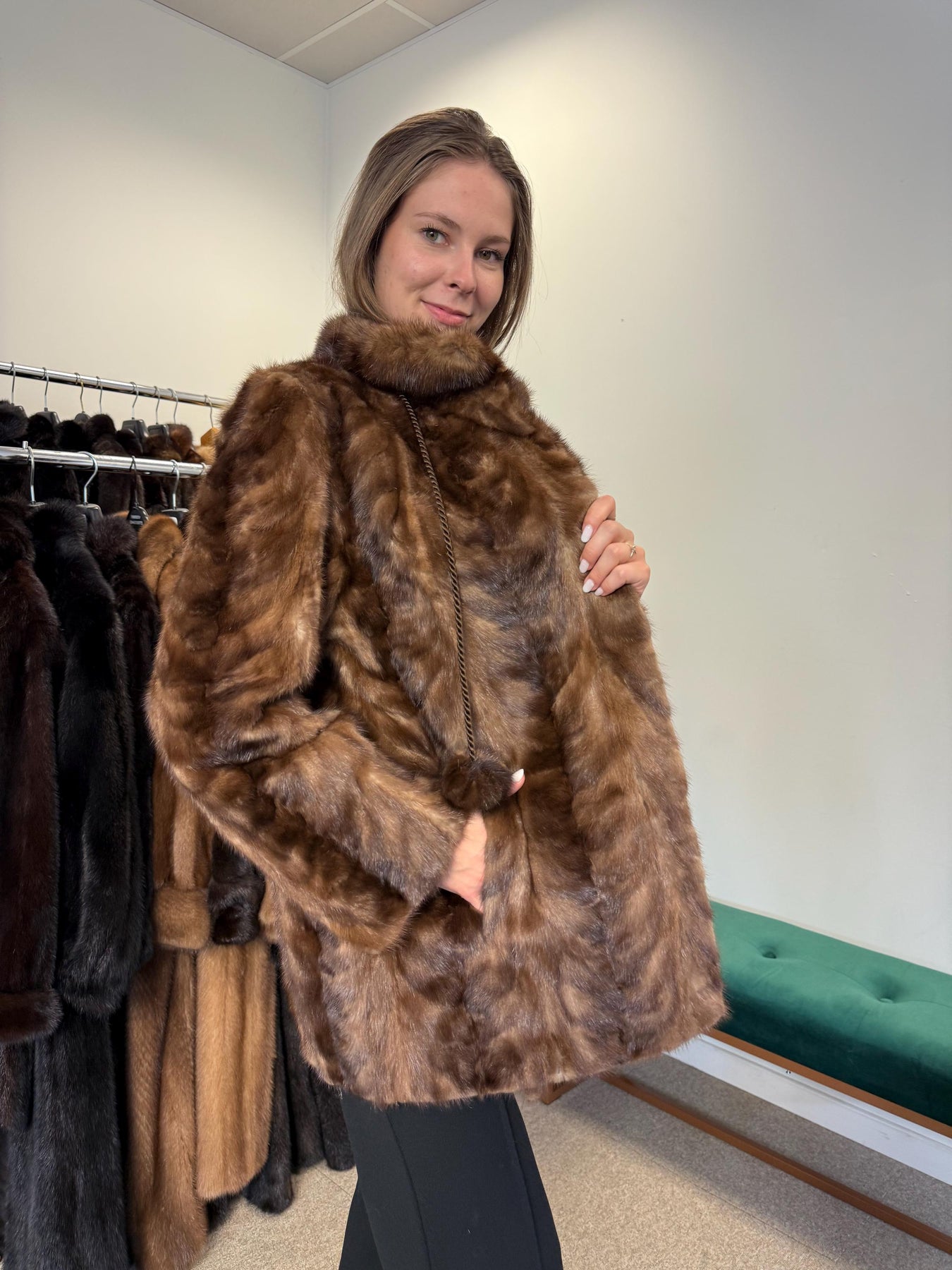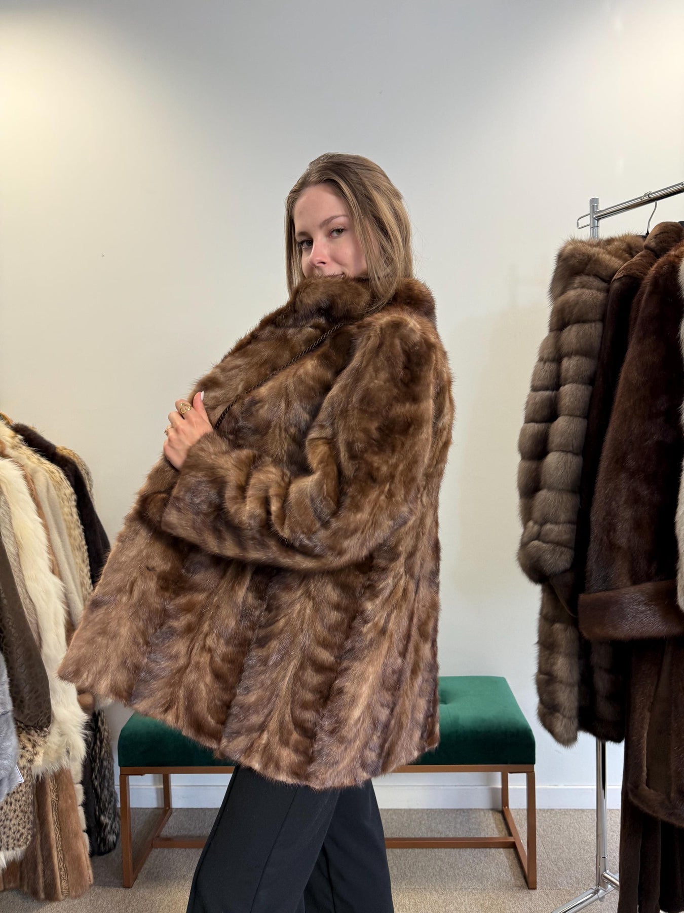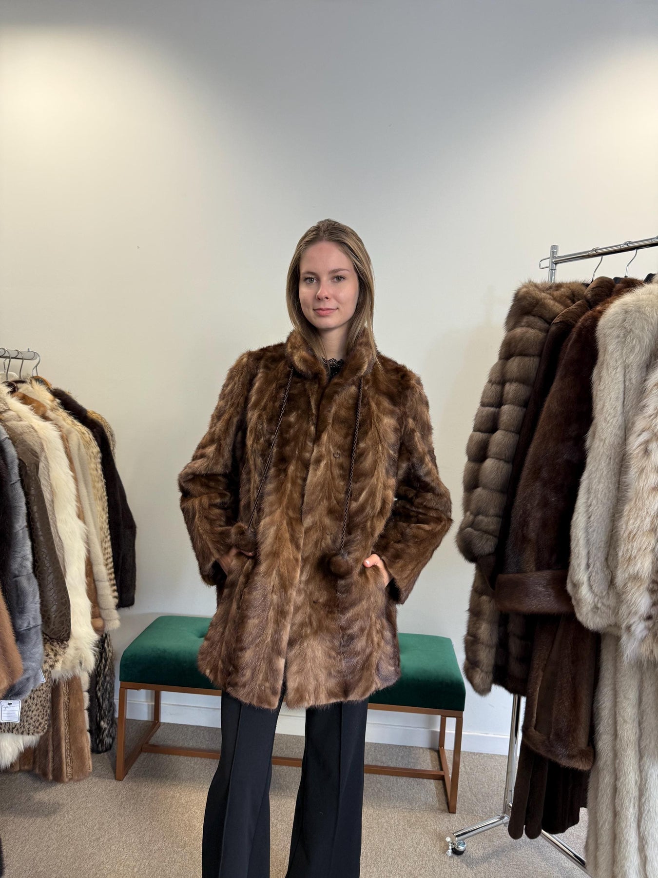 Full body view of brown mink fur jacket worn by model, women’s soft thick real vintage fur.