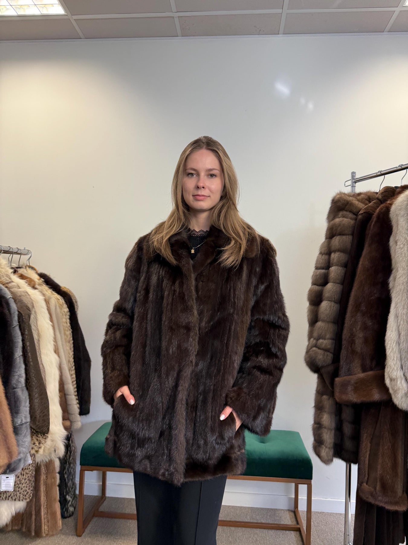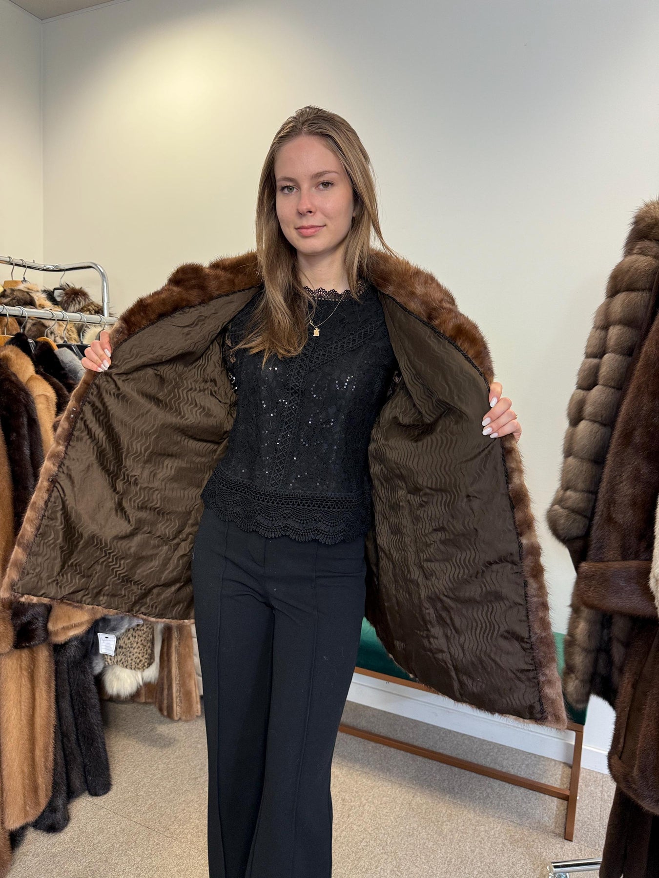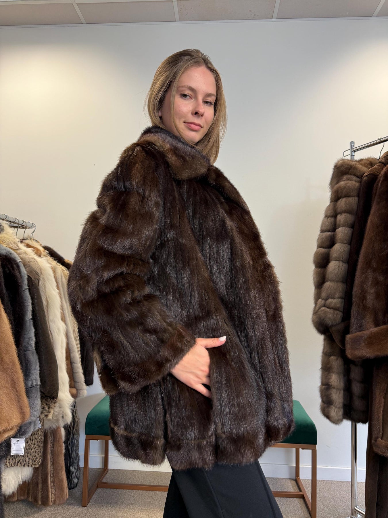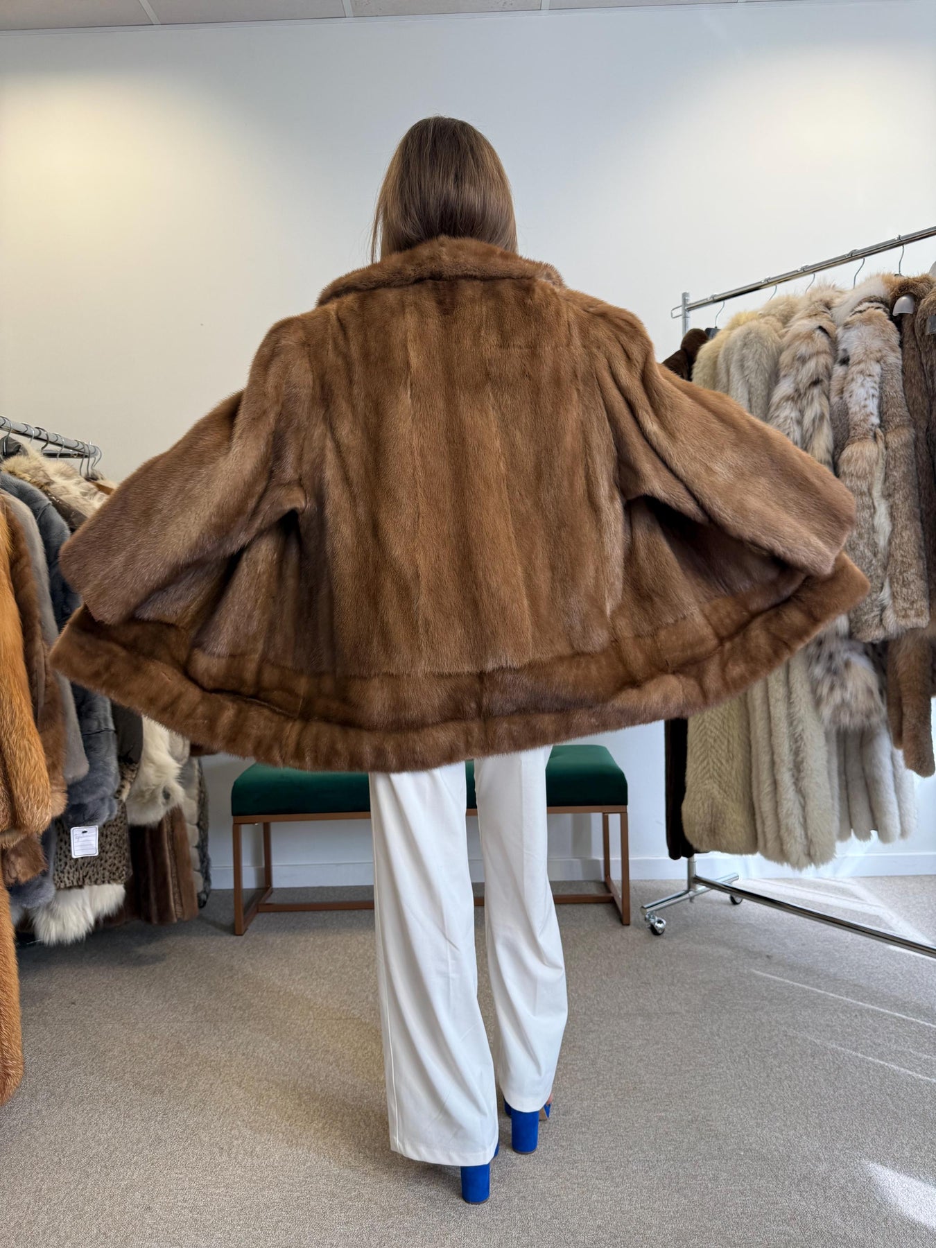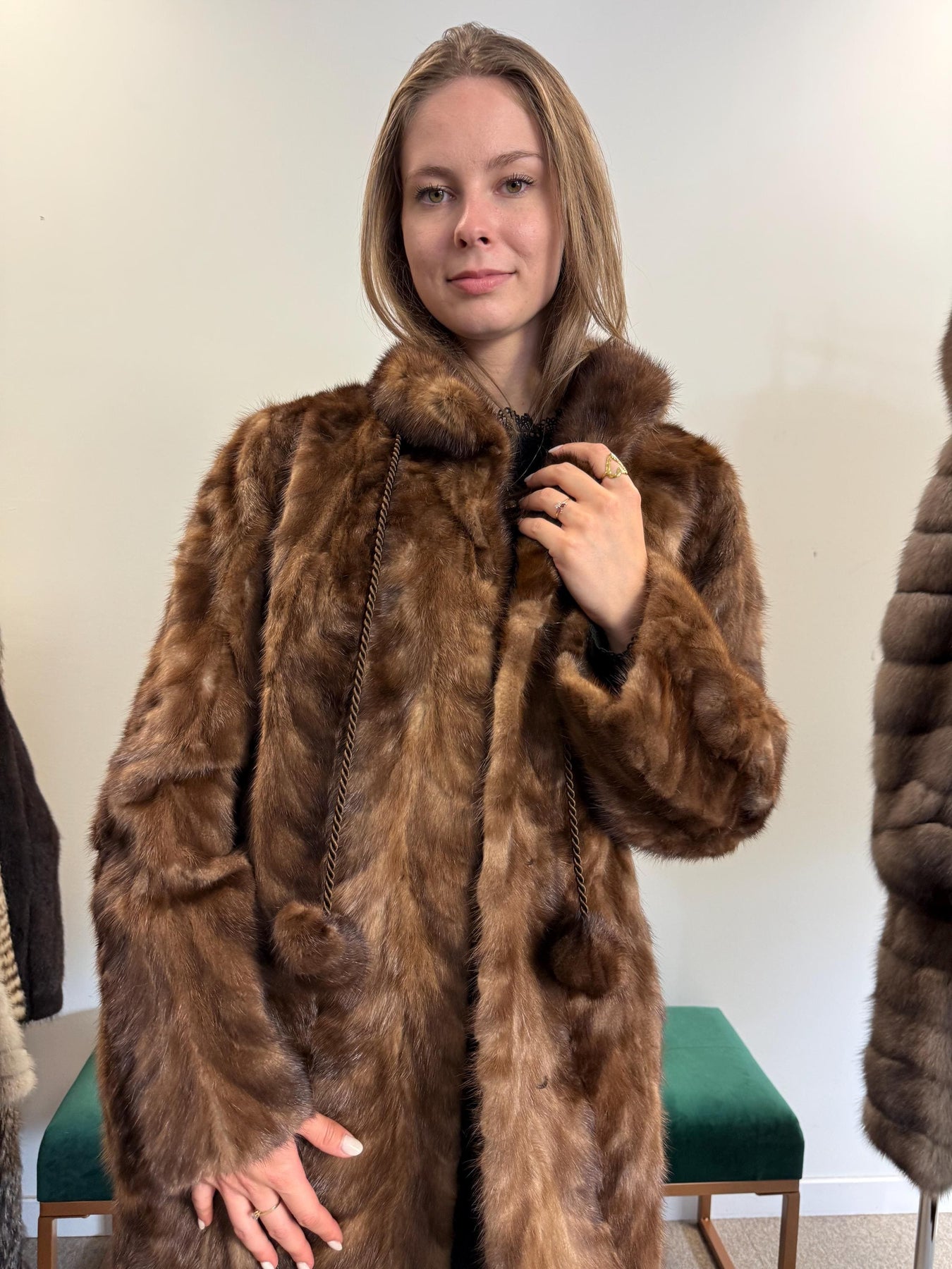 Full body view of brown mink fur jacket worn by model, women’s soft thick real vintage fur.