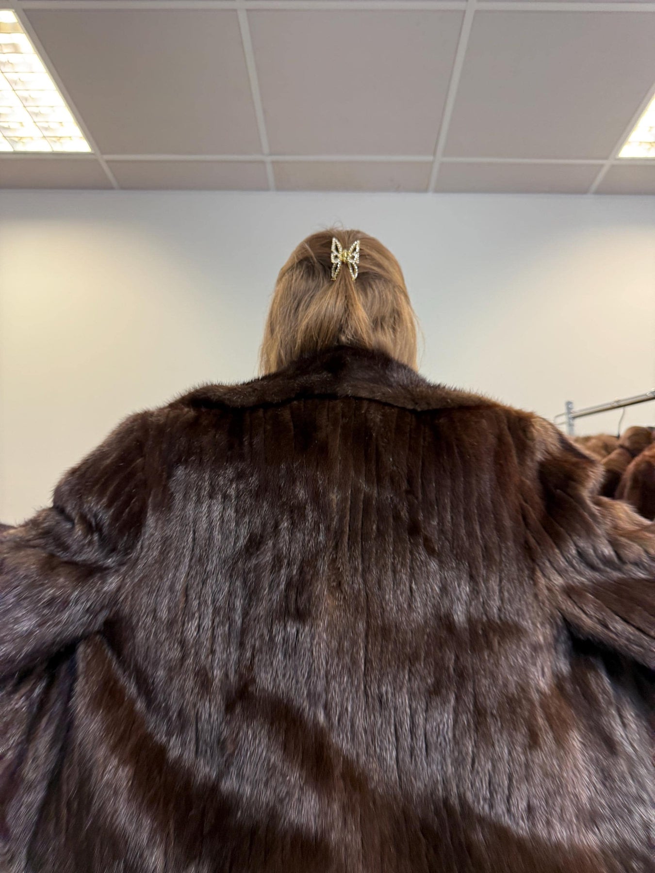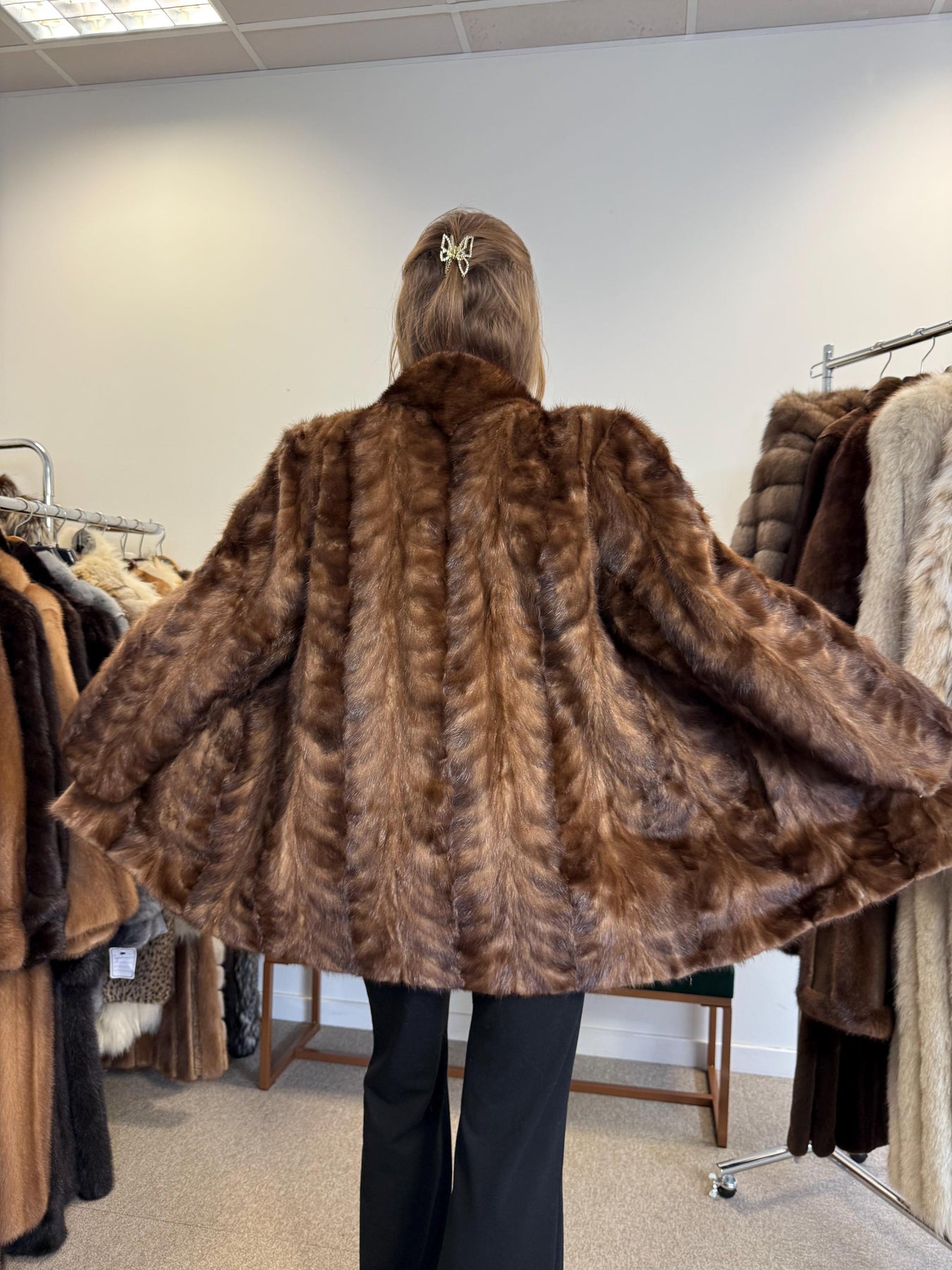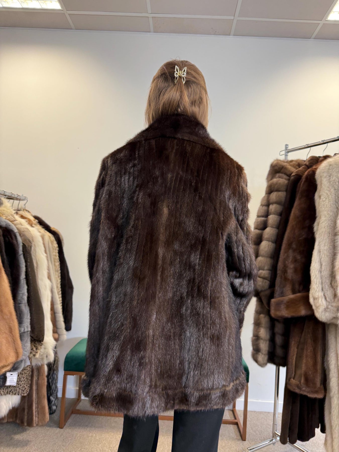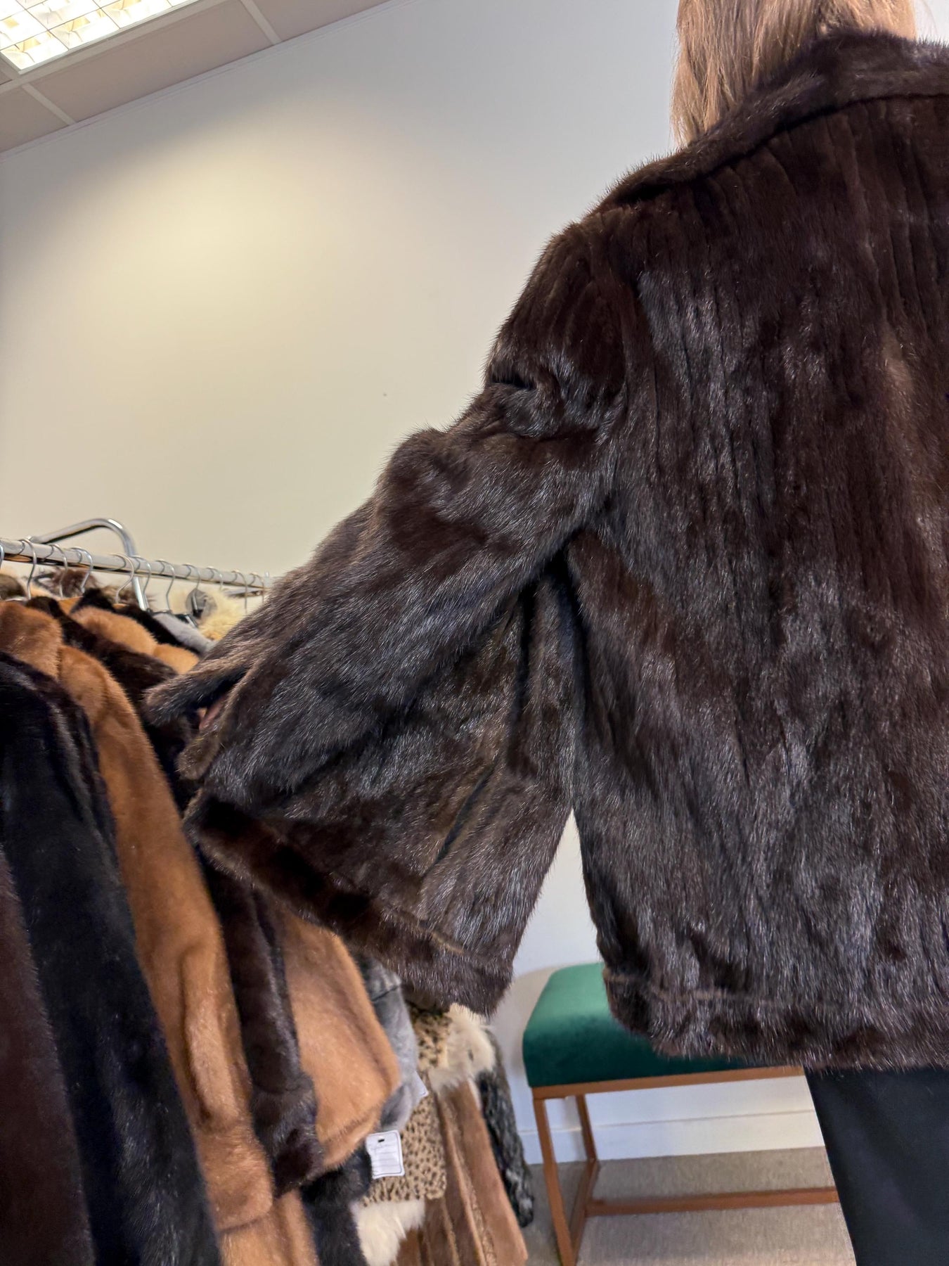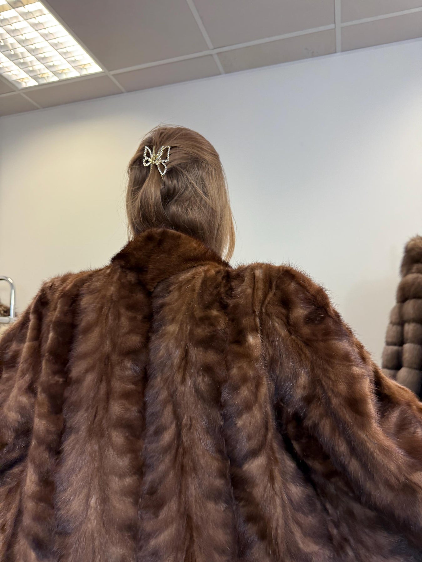 Real brown mink fur jacket, women’s vintage coat, soft thick fur, back view.