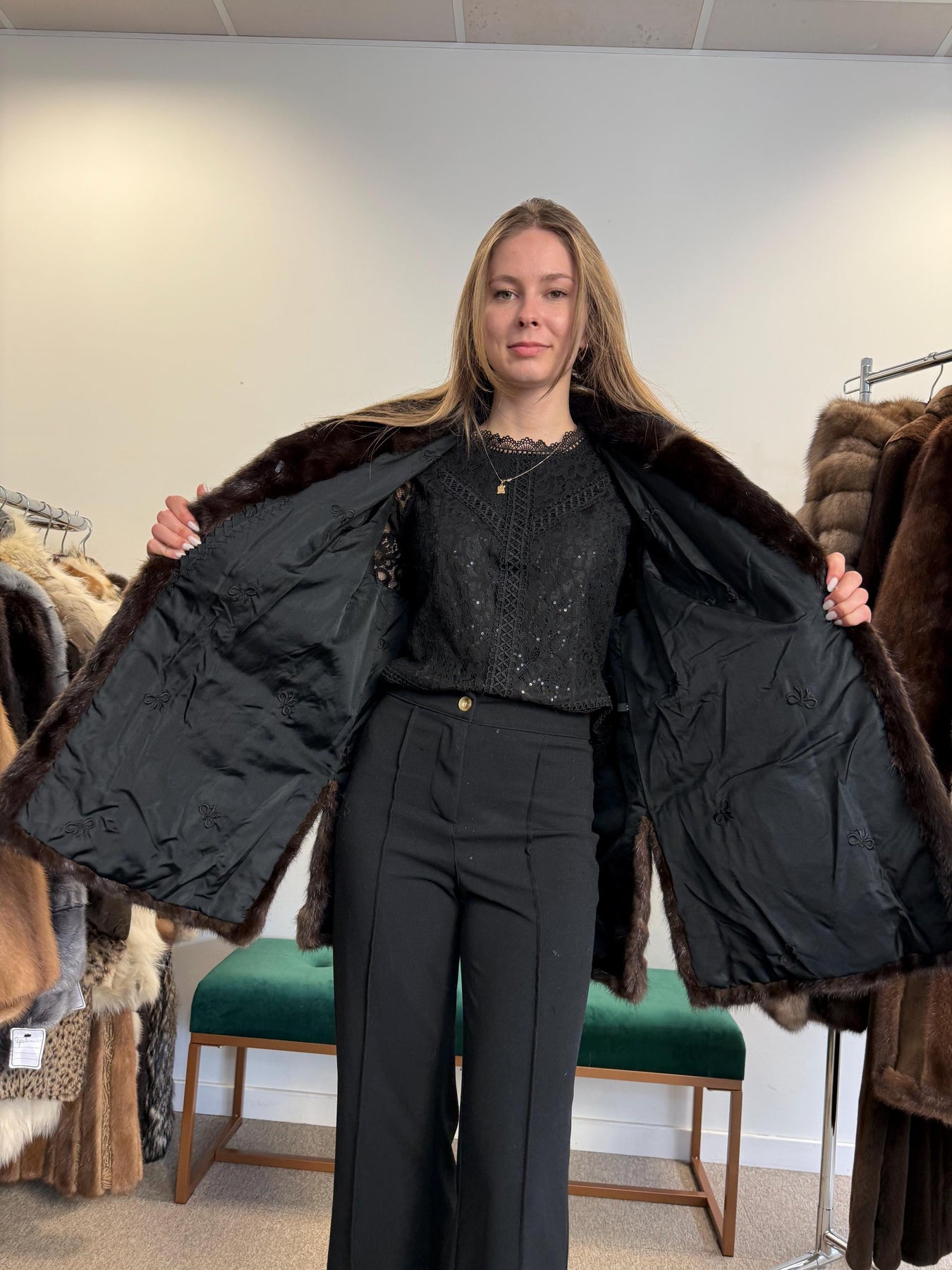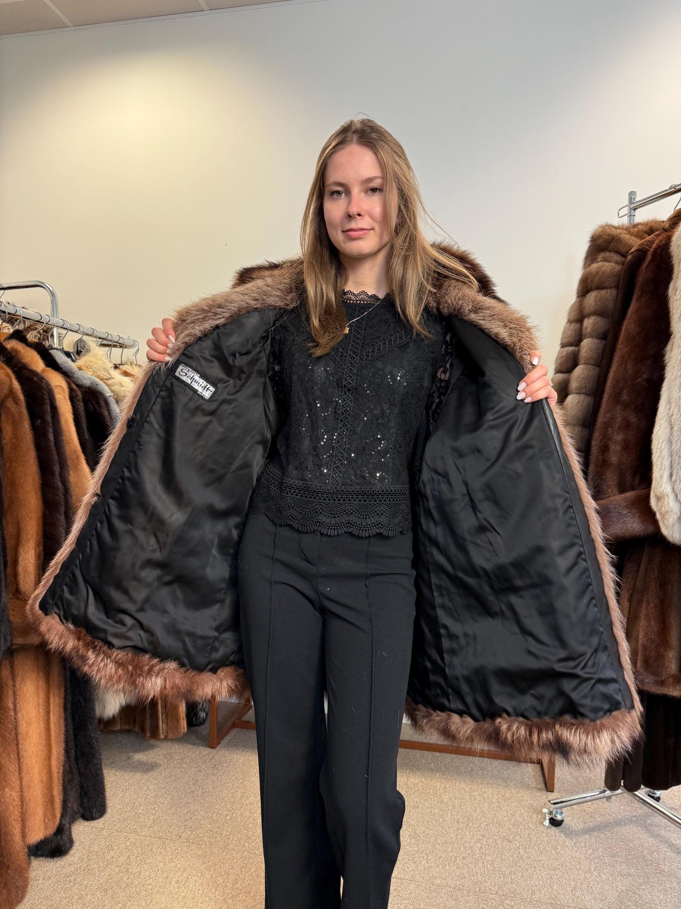 Interior lining detail of lynx fur coat, vintage full-length style, high-quality fur