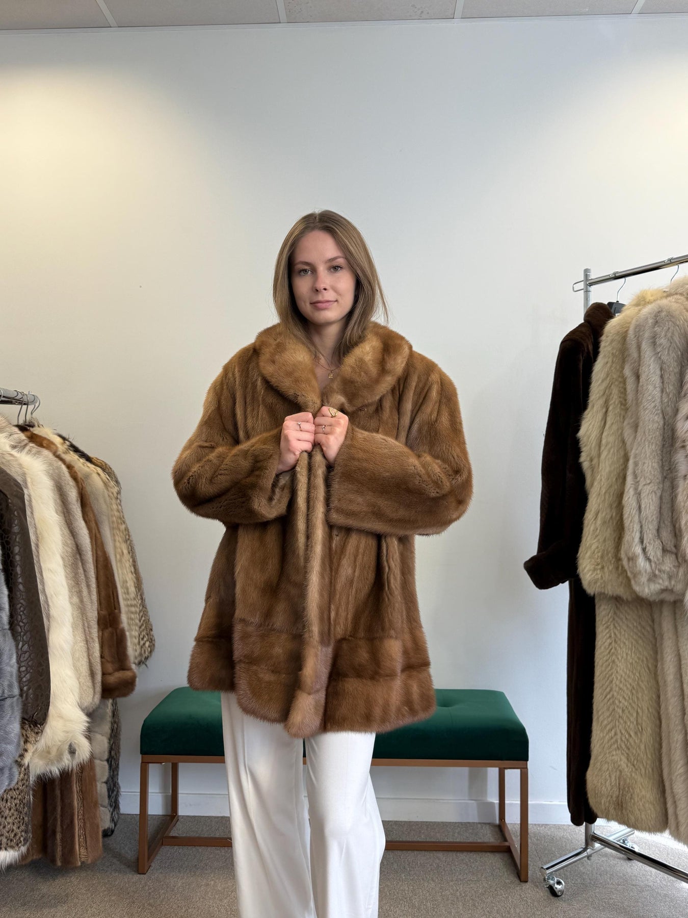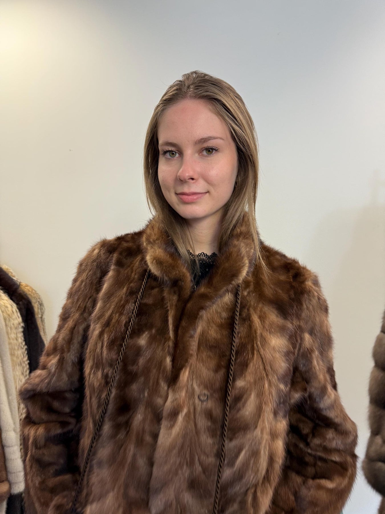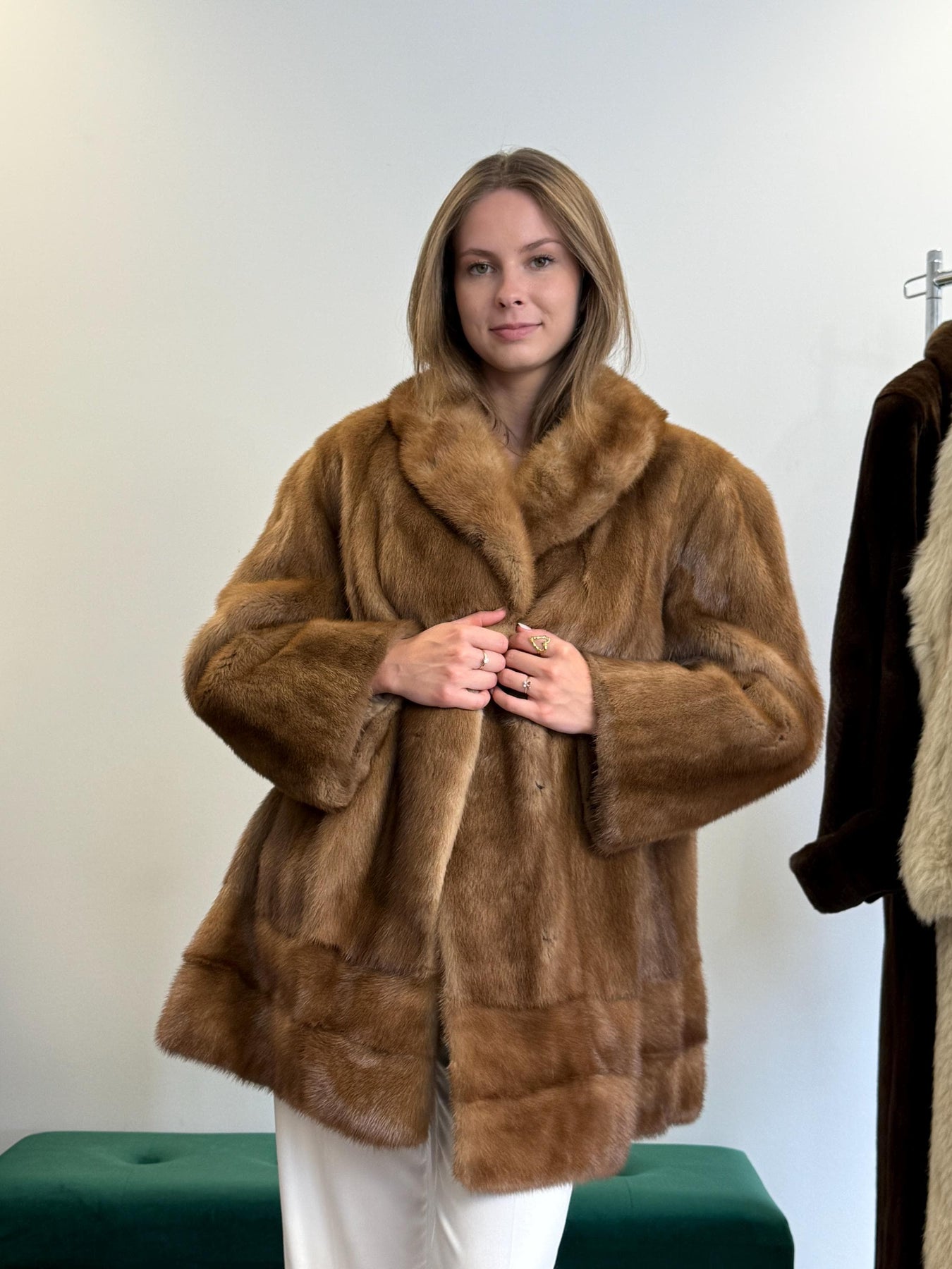 Women’s light brown mink jacket worn closed, XL size, soft luxurious vintage fur.
