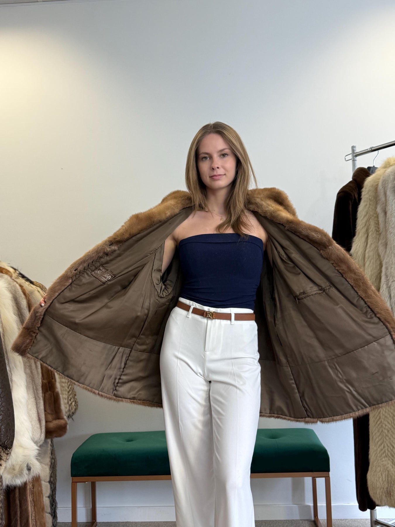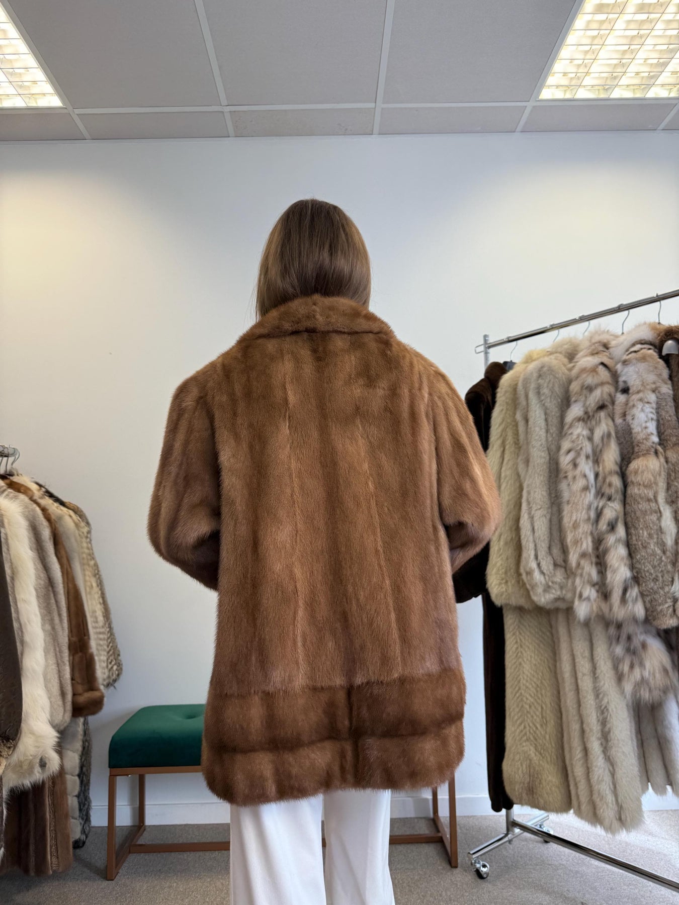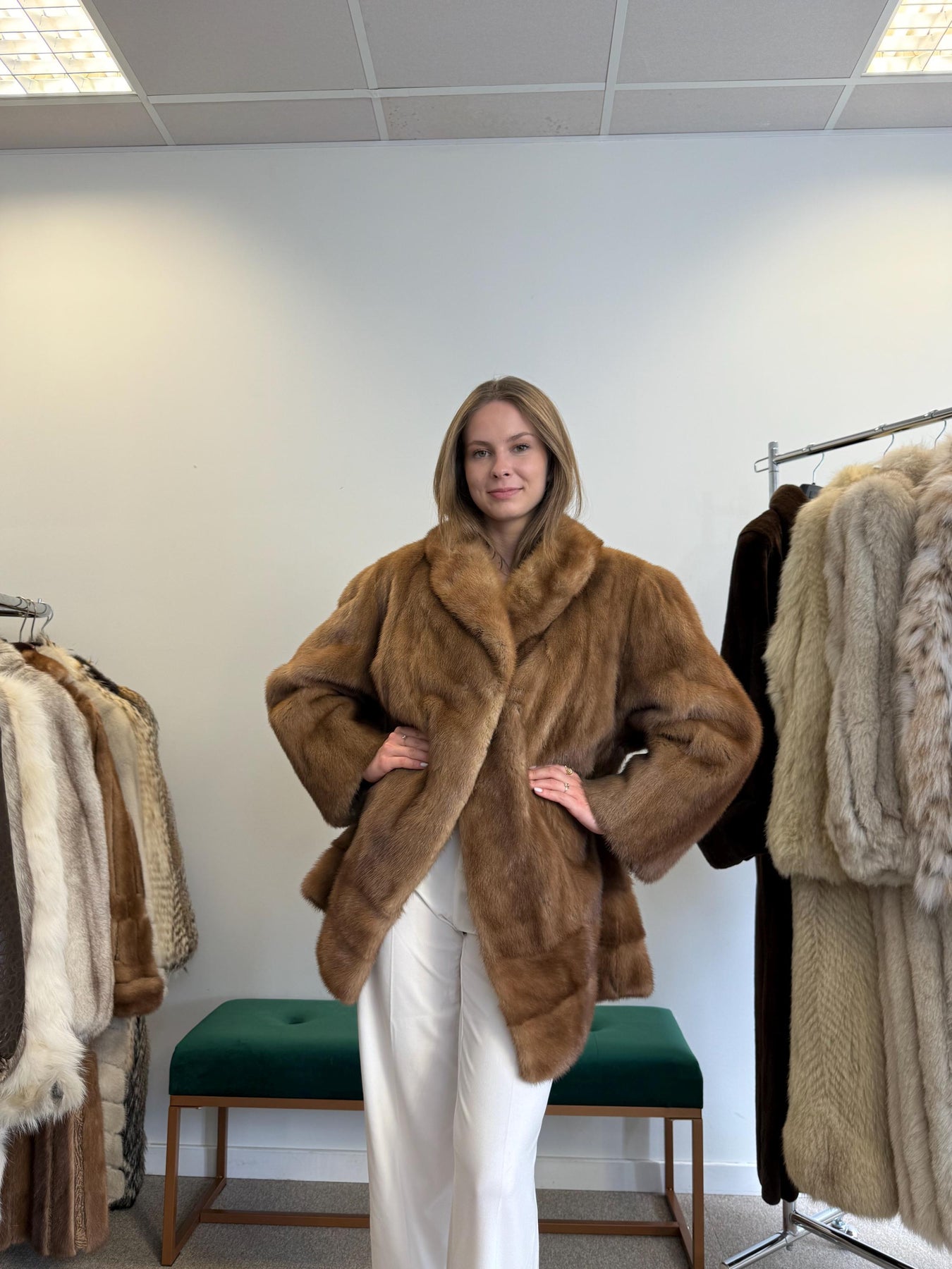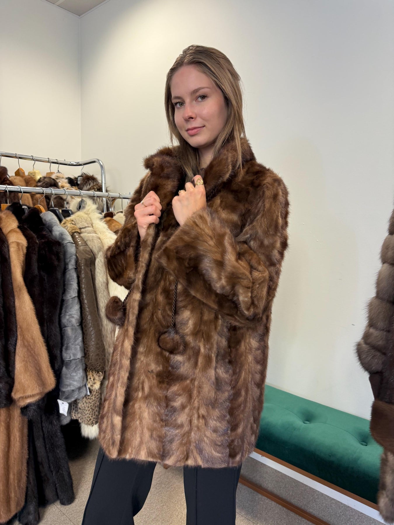 Women’s light brown mink jacket worn closed, XL size, soft luxurious vintage fur.