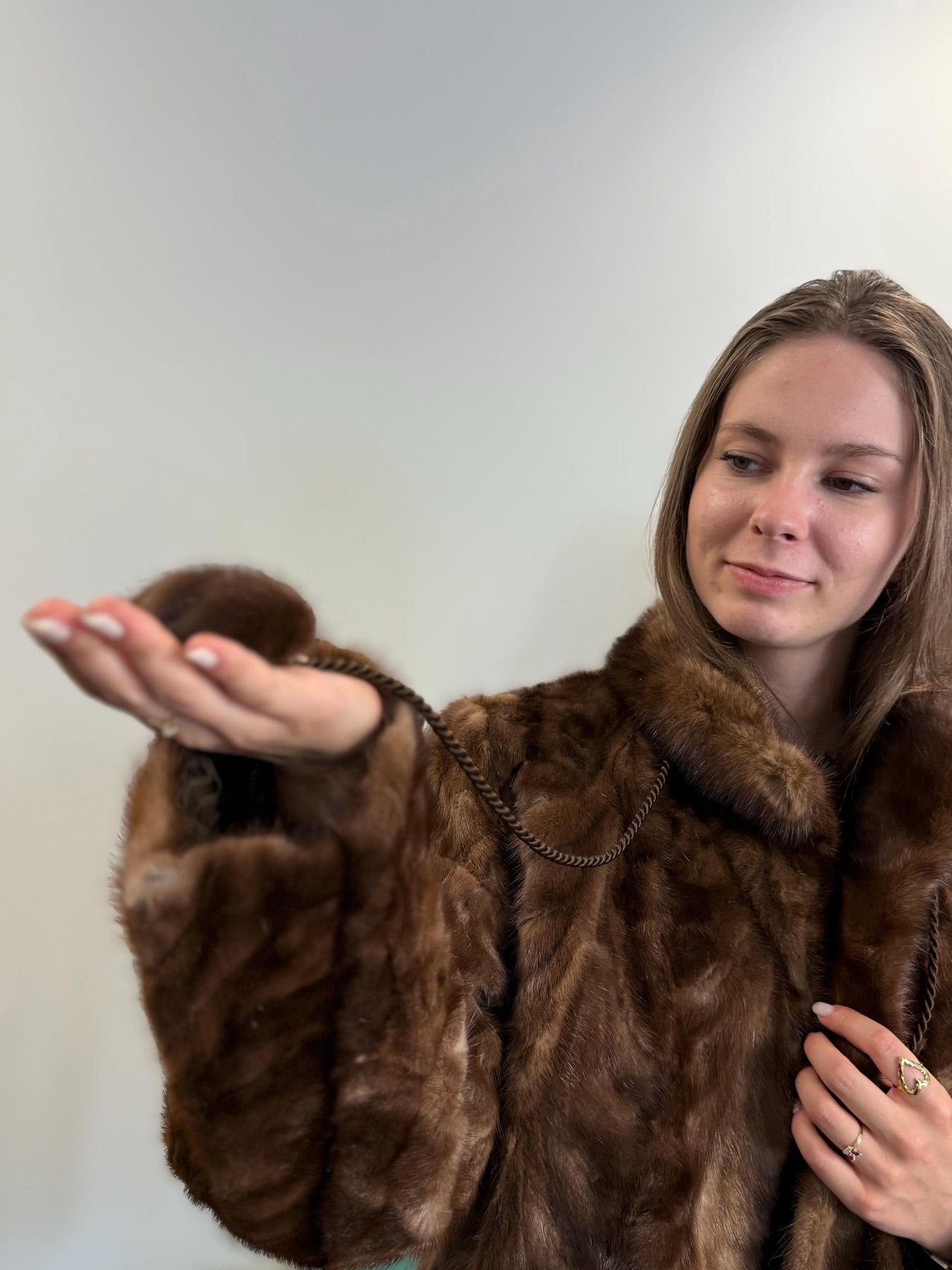 Women’s brown mink fur jacket worn closed, soft thick real fur, vintage style