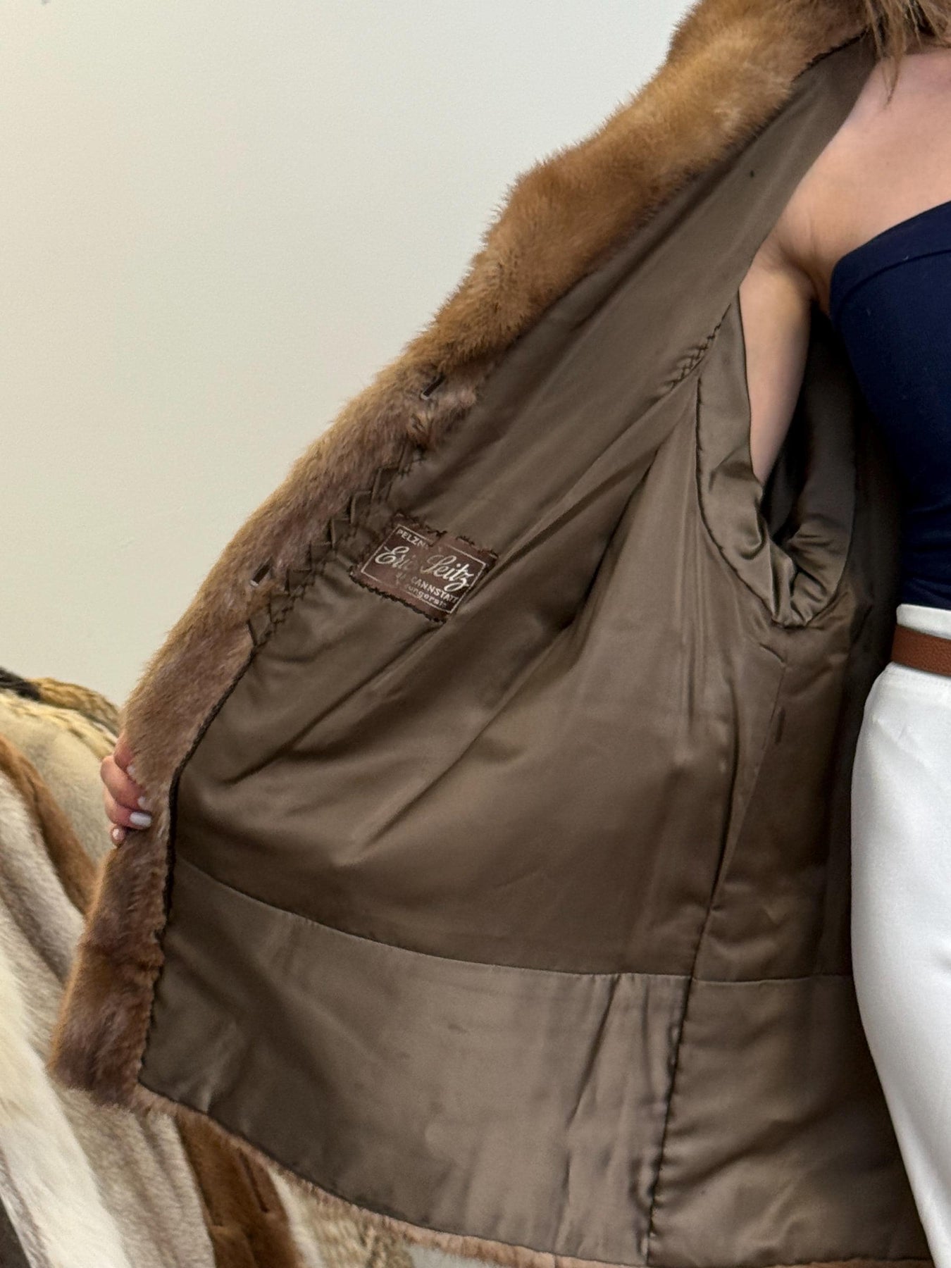 Functional pockets of light brown mink jacket, women’s XL, soft fluffy vintage fur.