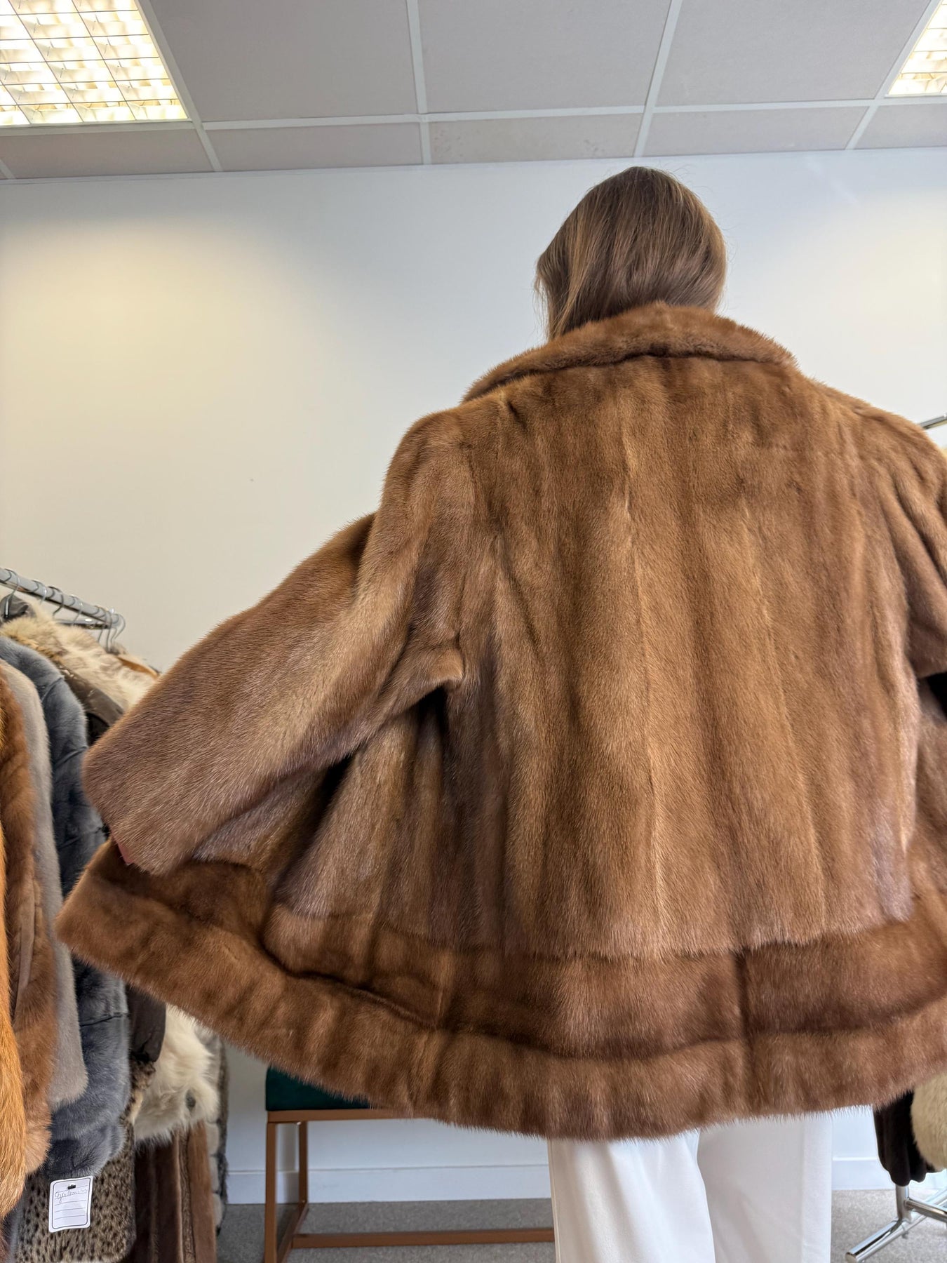 Side view of light brown mink jacket, women’s XL, soft thick real vintage fur.