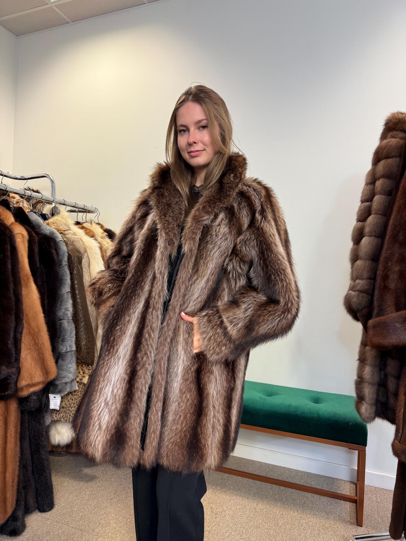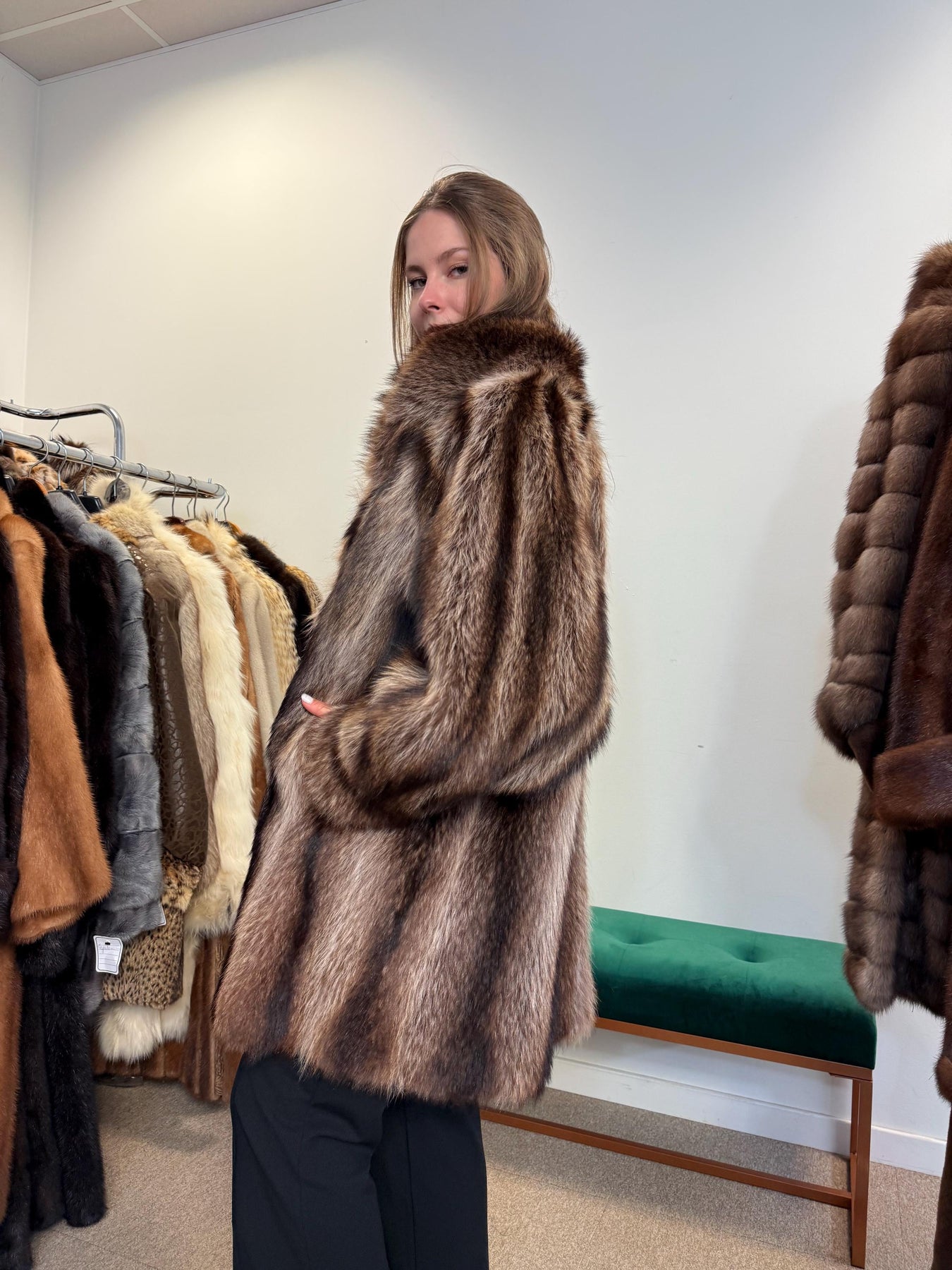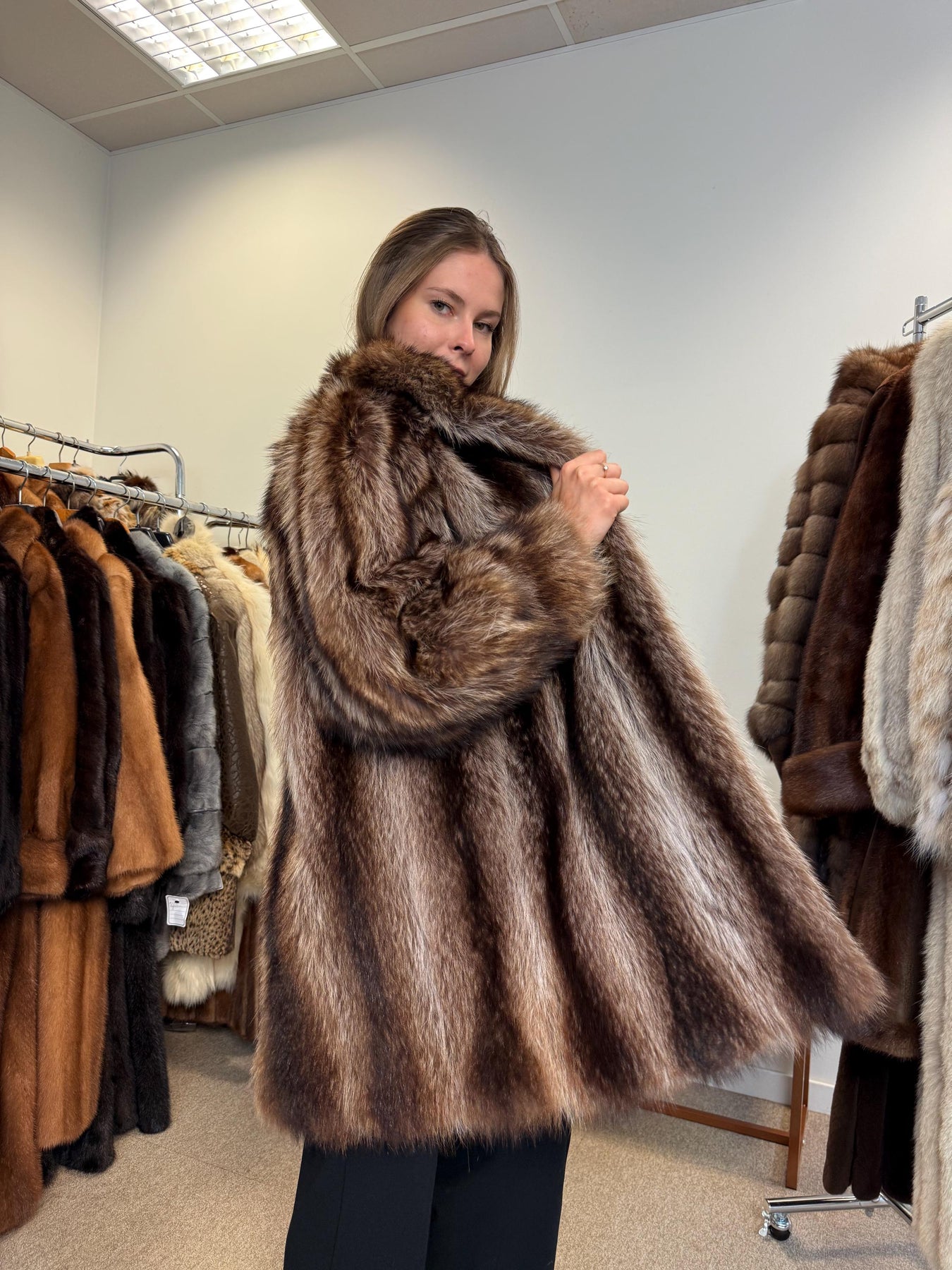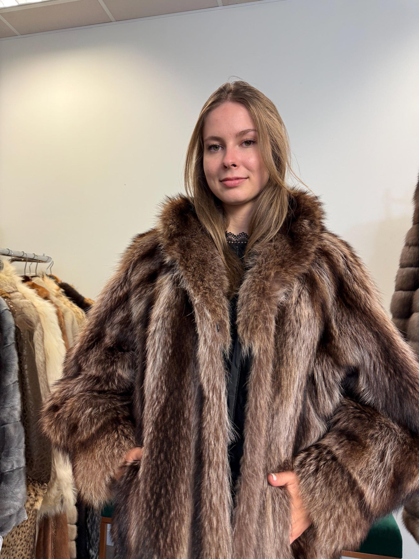 Vintage real raccoon fur coat, women’s extra large size, rare natural colour fur, luxury outerwear modelled.
