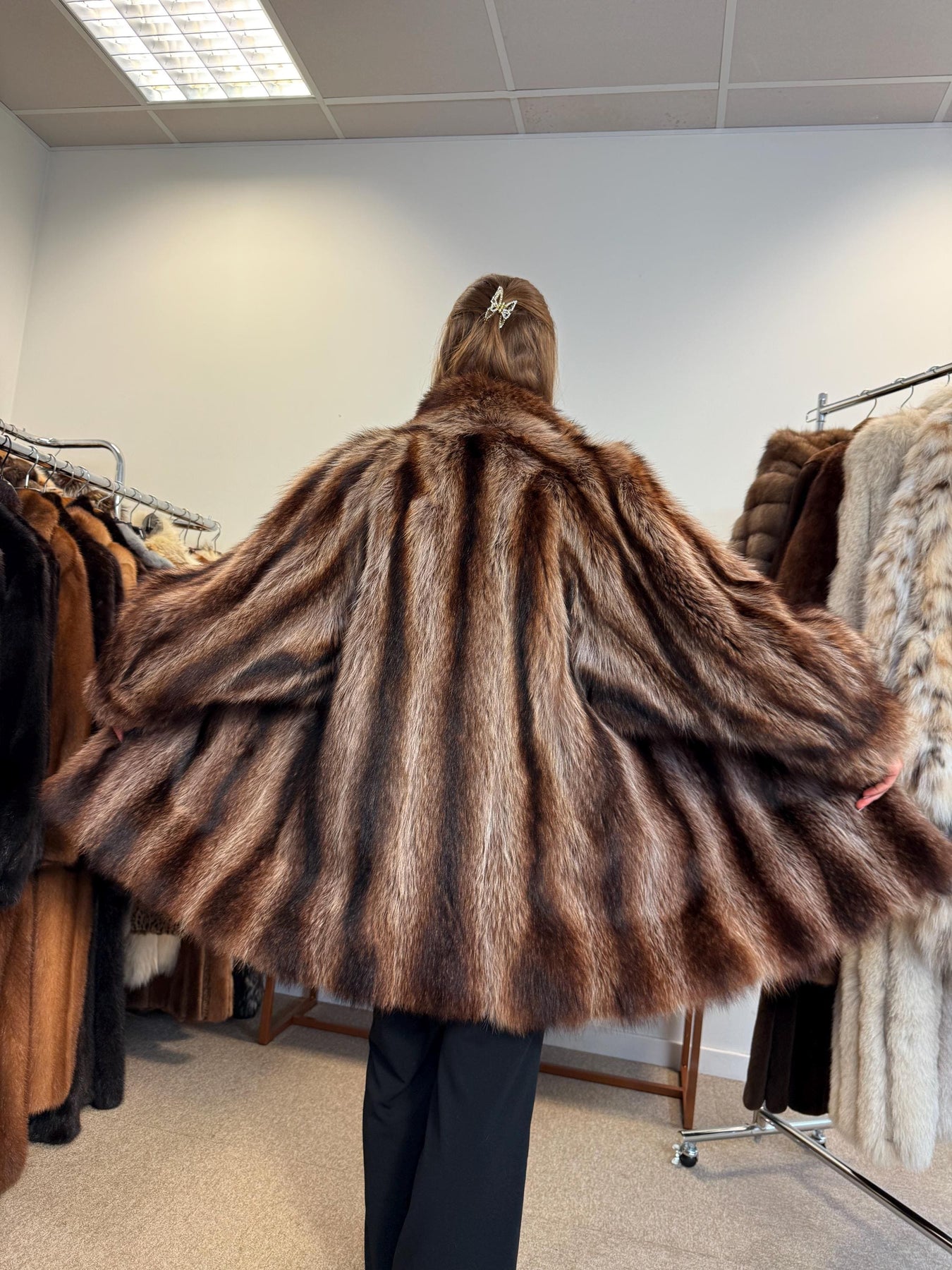 Authentic vintage lynx fur coat, women’s XL size, natural colour, back view.