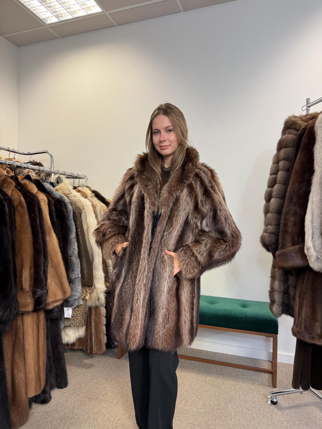 Functional pockets of lynx fur coat, full-length vintage style, women’s real fur