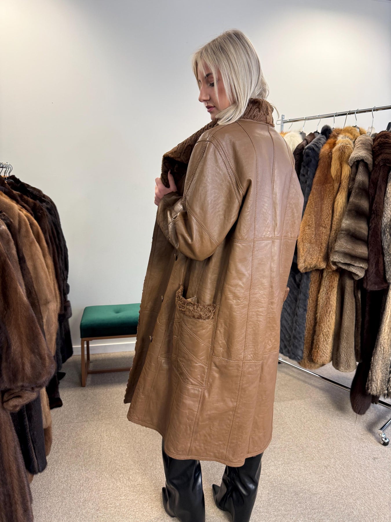 Green Astrakhan Leather Coat, S Size, Double Sided Coat, Vintage Fur Coat, Real Fur Coat, Fur Leather Coat, Womens Fur Coat, Astrakhan Fur