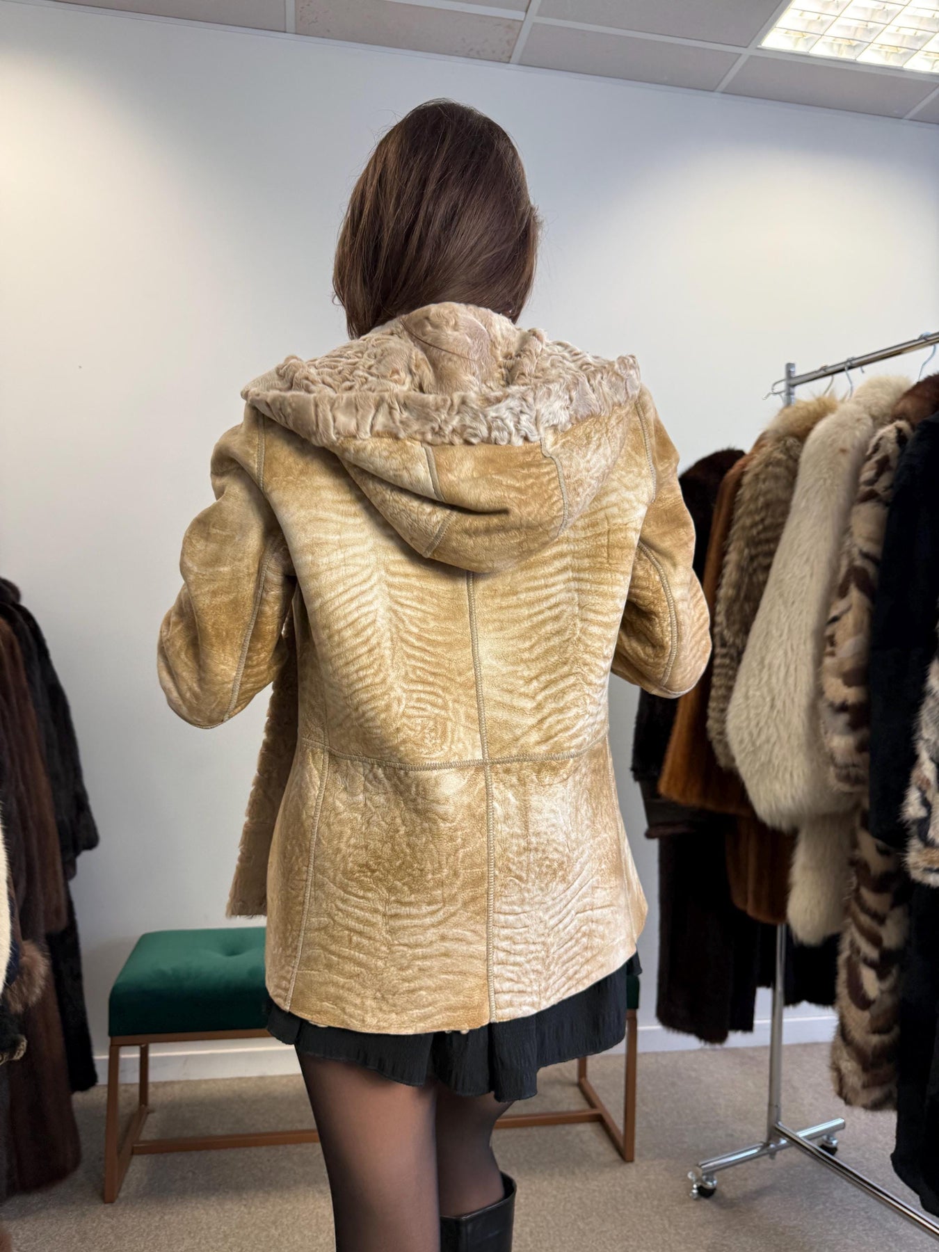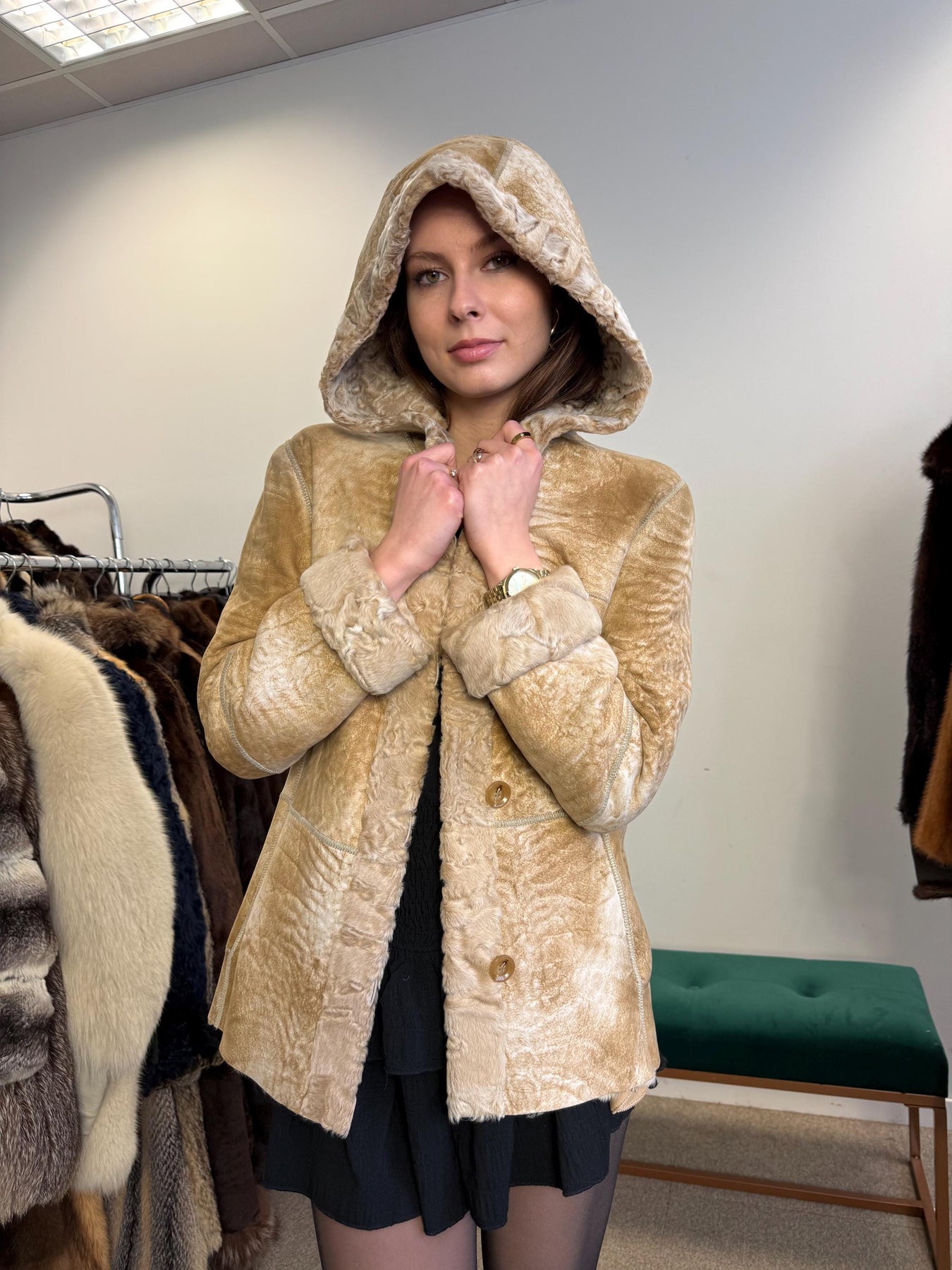 Double Sided Astrakhan Leather Jacket, XS Size, Golden Fur Coat, Real Fur Jacket, Vintage Fur Coat, Astrakhan Leather Jacket, Hooded Coat