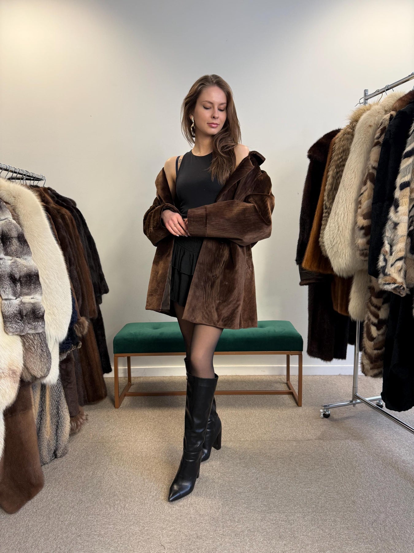 Dark Brown Velvet Fur Jacket, Vintage Lackotter Fur, Large Size, Sheared Muskrat Seal-Look Coat, Luxury Fur Jacket, Velvet Jacket, Luxury